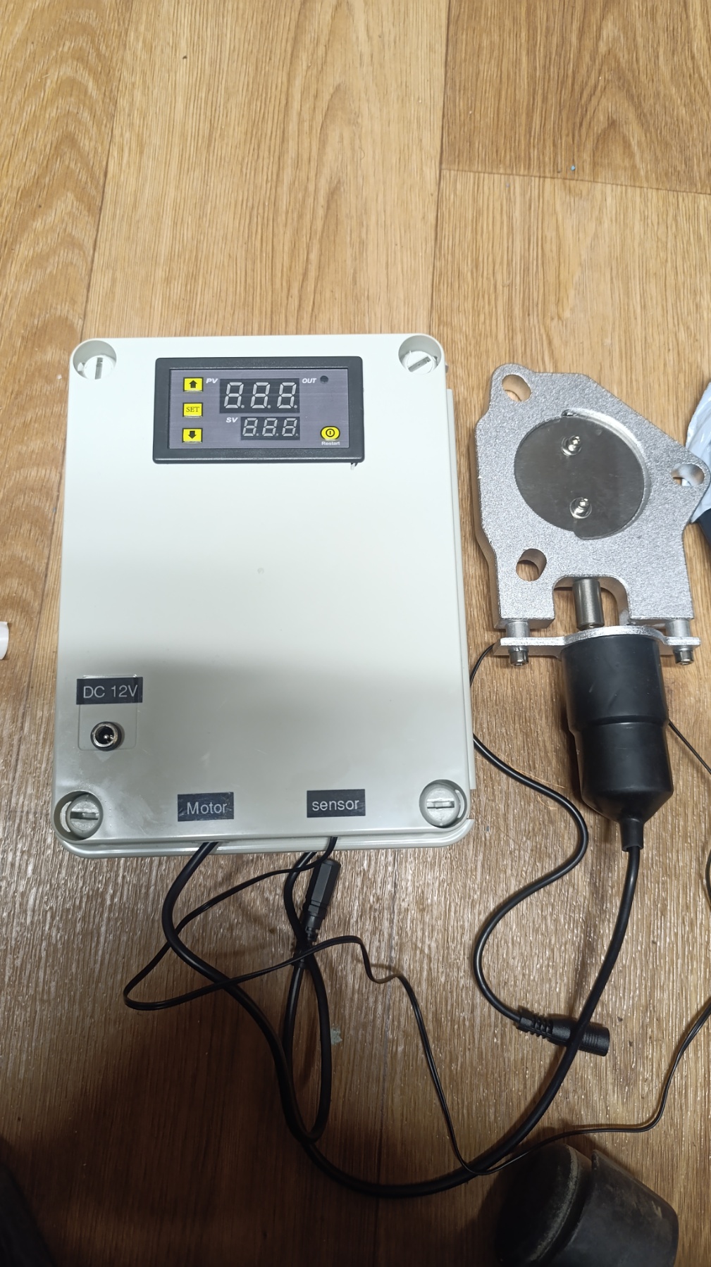 По желание на един приятел, направих една елементарна автматика за регулиране на температурата на водата от котела. Схемата включва термостат с възможност за голям хистерезис в случая 20 градуса, за да може да се включва примерно при 40 градуса и да изключва при 60 градуса. Вслучая се управлява клапа която по принцип е предназначена за изпускателни системи на автомобили, тя представлява реверс мотор с редуктор и тръба с клапа от неръждаема стомана.