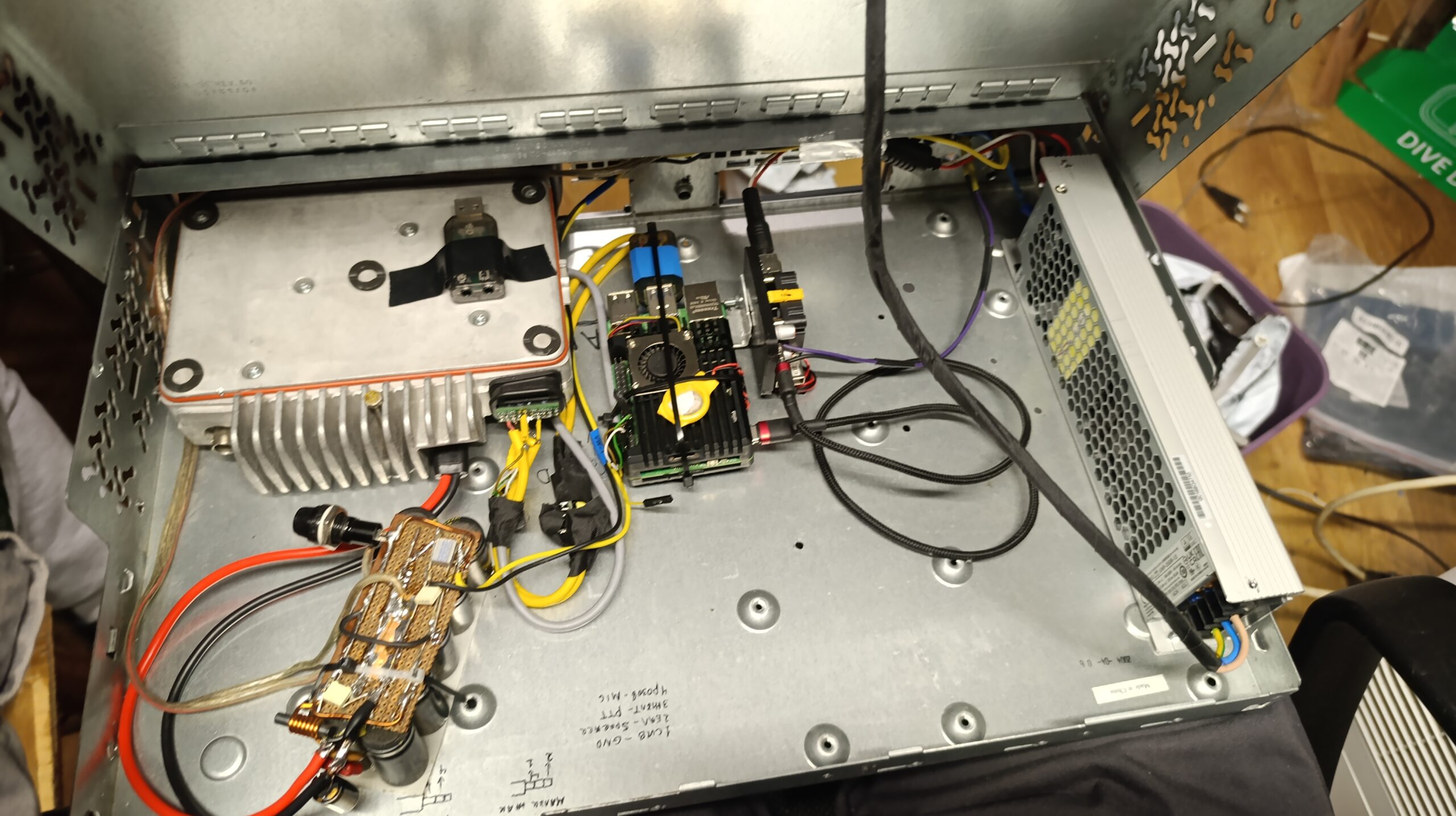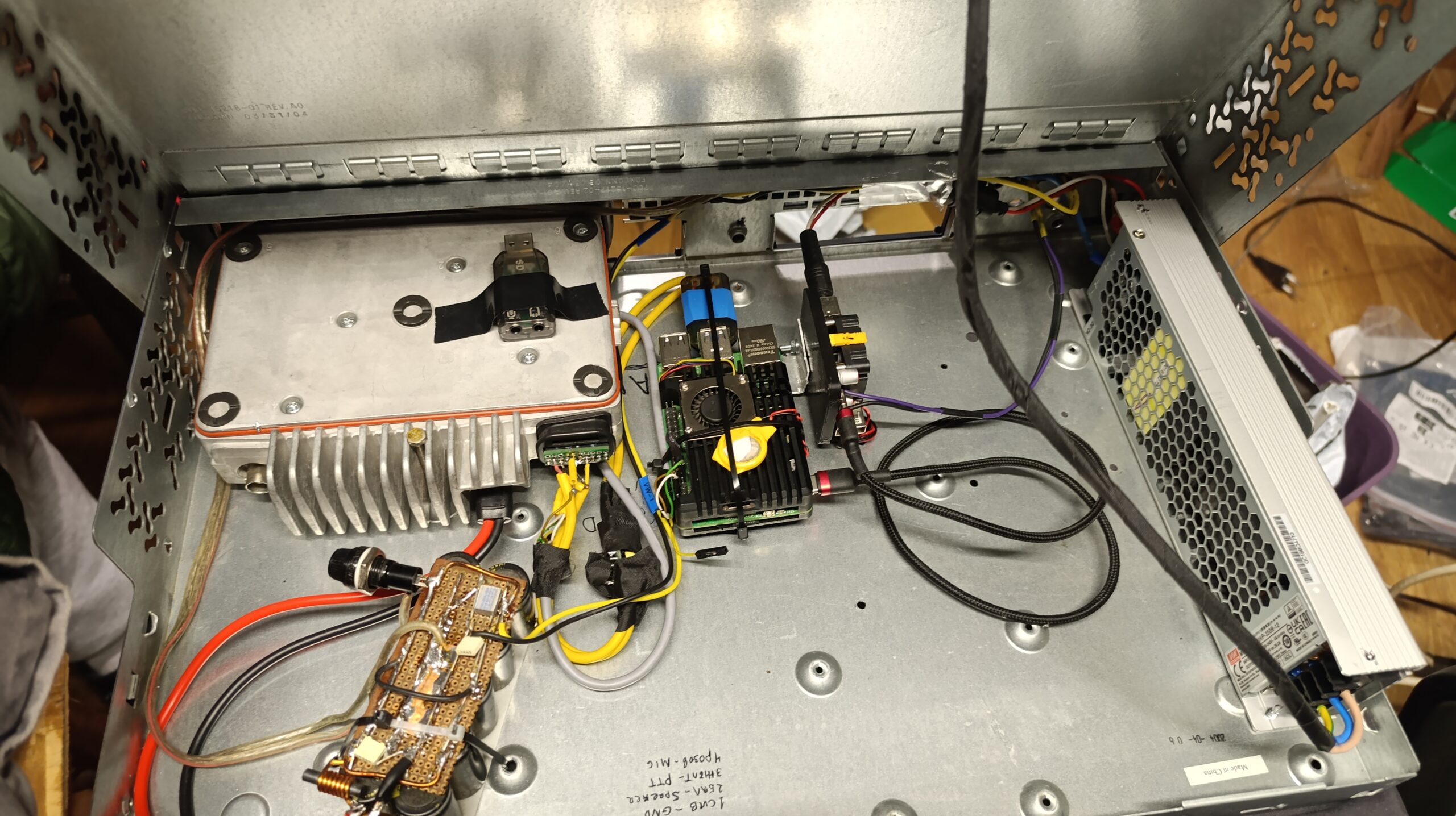 Това направление в електрониката ми е едно от любимите, забравих да се похваля от известно време вече съм със собствена позивна LZ1VSH. На фирмената ни куличка сложихме един репитер LZ0PEC, малко ми е далеч за да го действам с портативната радиостанция, трябва ми външна антена и скоро ако климата позволява ще я монтирам , за съжаление тази дейност остава само в свободното време. Имаме и ехолинк към репитера втора версия и го преработих с по – добро радио , от UV5R минаваме на motorola GM340, новото шаси е с 350вата захранване MeanWell UHP-350R-12 и голяма кондензаторна група 47 000 микрофарада. Миникомпютъра е Rasbery Pi5. Антената също искаше донастройка на КСВ, за целта ползвах един Surecom SW 102 + Nano VNA v2. Използваната кутия е от суич 1,5U за 19 инчов рак на която предния панел все още не беше довършен.