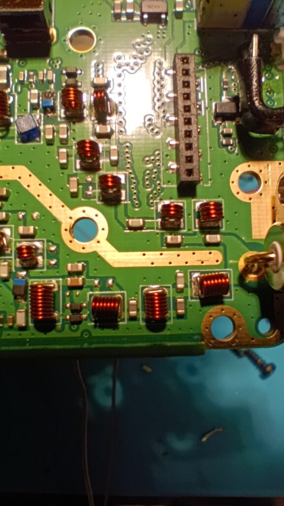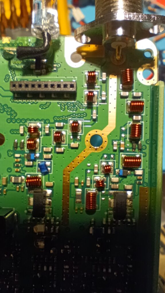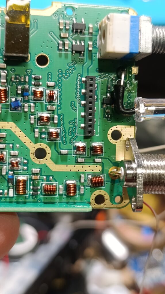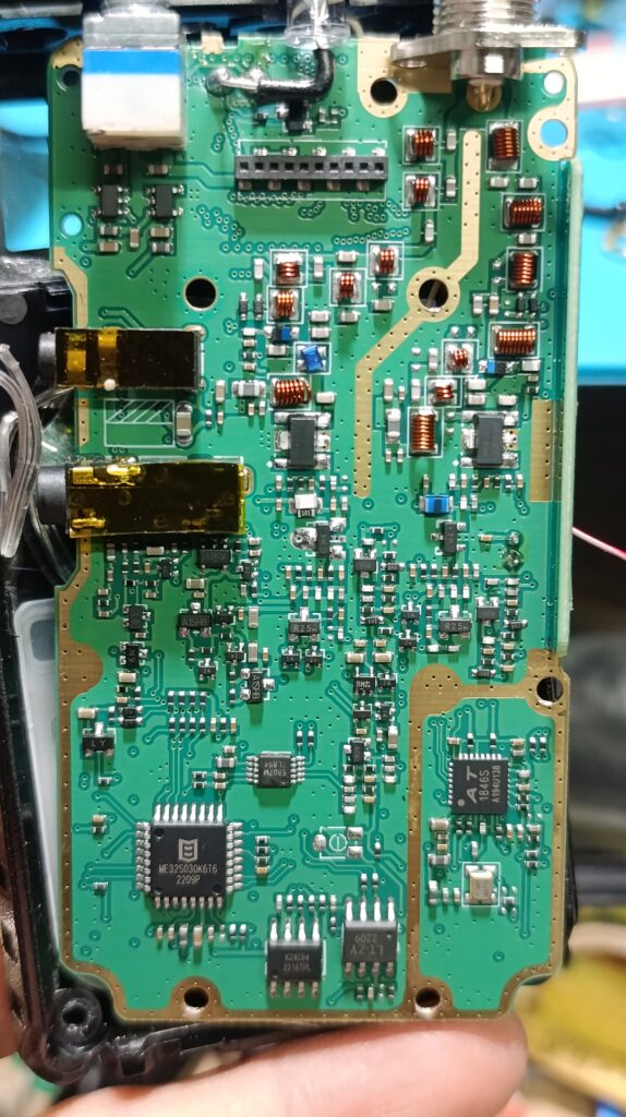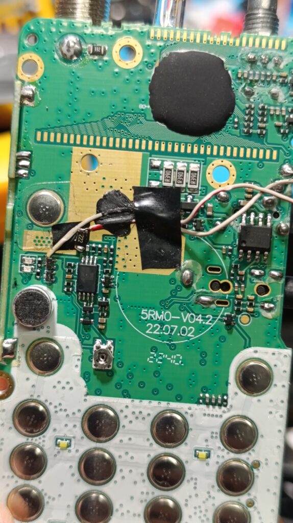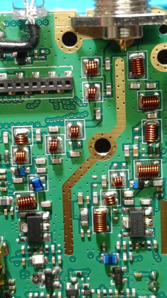 Бауфенга беше спрял да предава затова му направих „дисекция“, двата банда са разделени с ЛЦ филтри и са с идентични крайни транзистори, за да го използваме за ехолинка му направих извод от RX индикаторния светодиод подпрян с един резистор спрямо захранването. Така всъщност колектора на транзистора освен светодиода за индикация ми ъправляваше и оптрона който бях закачил на малинката и така тя детектваше задействано приемане.