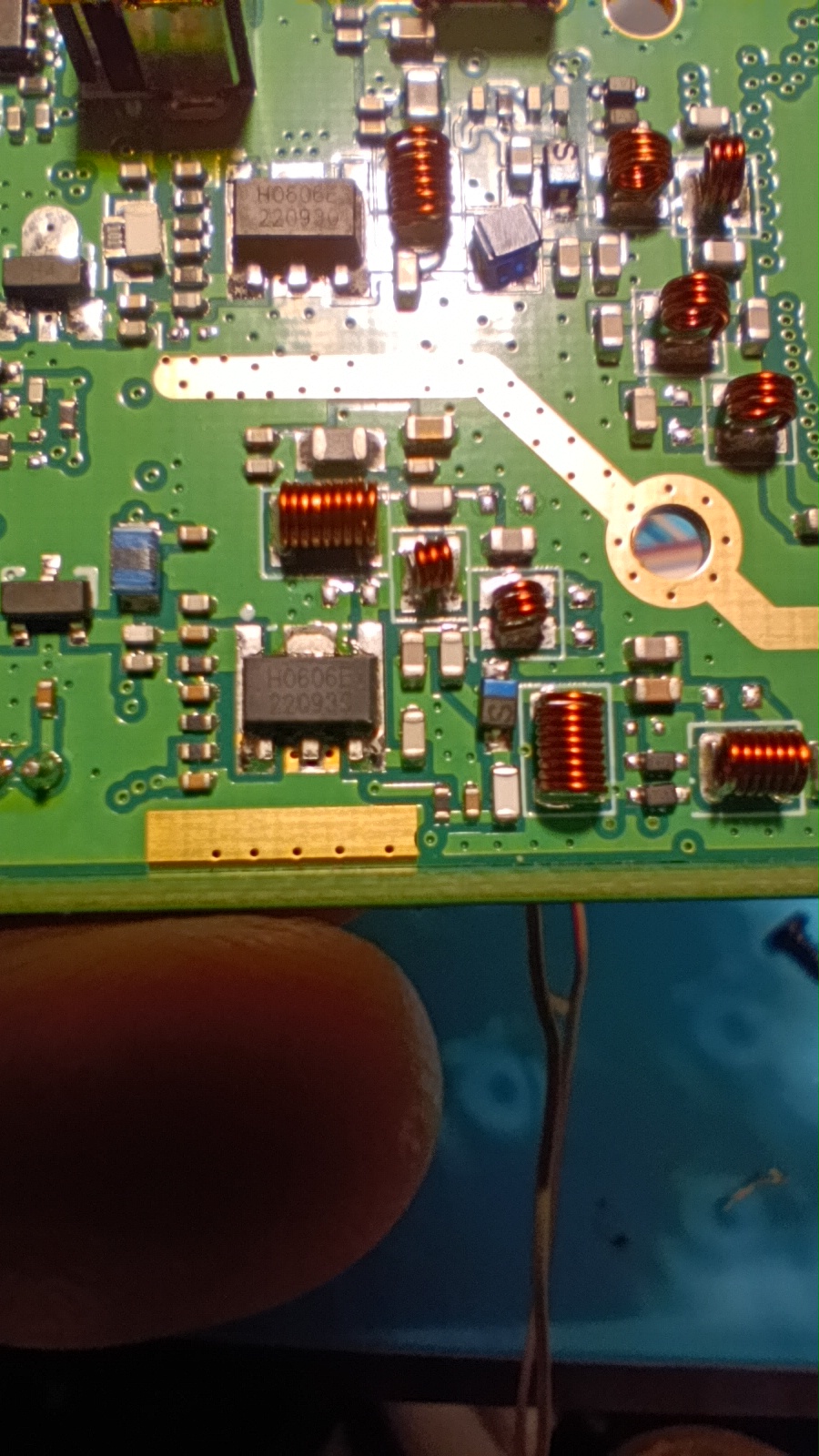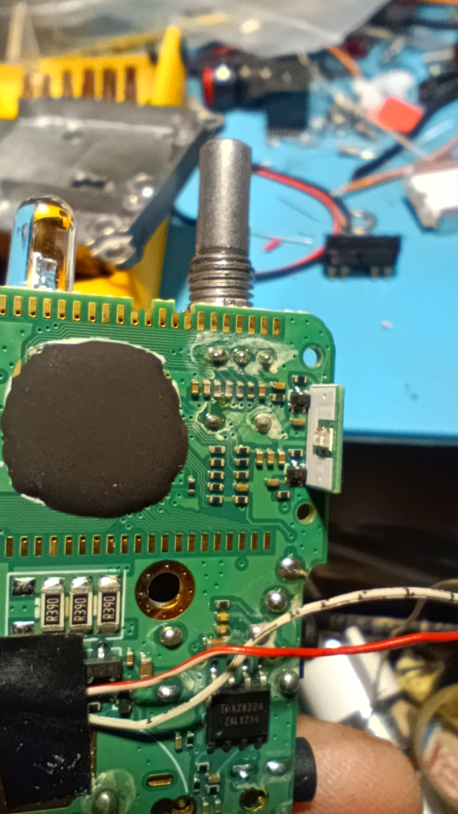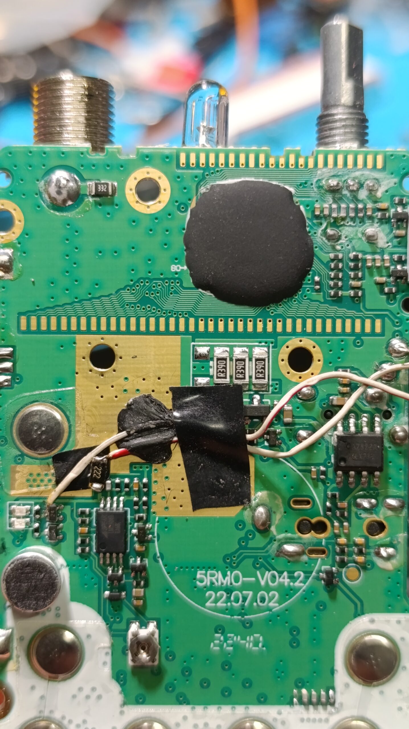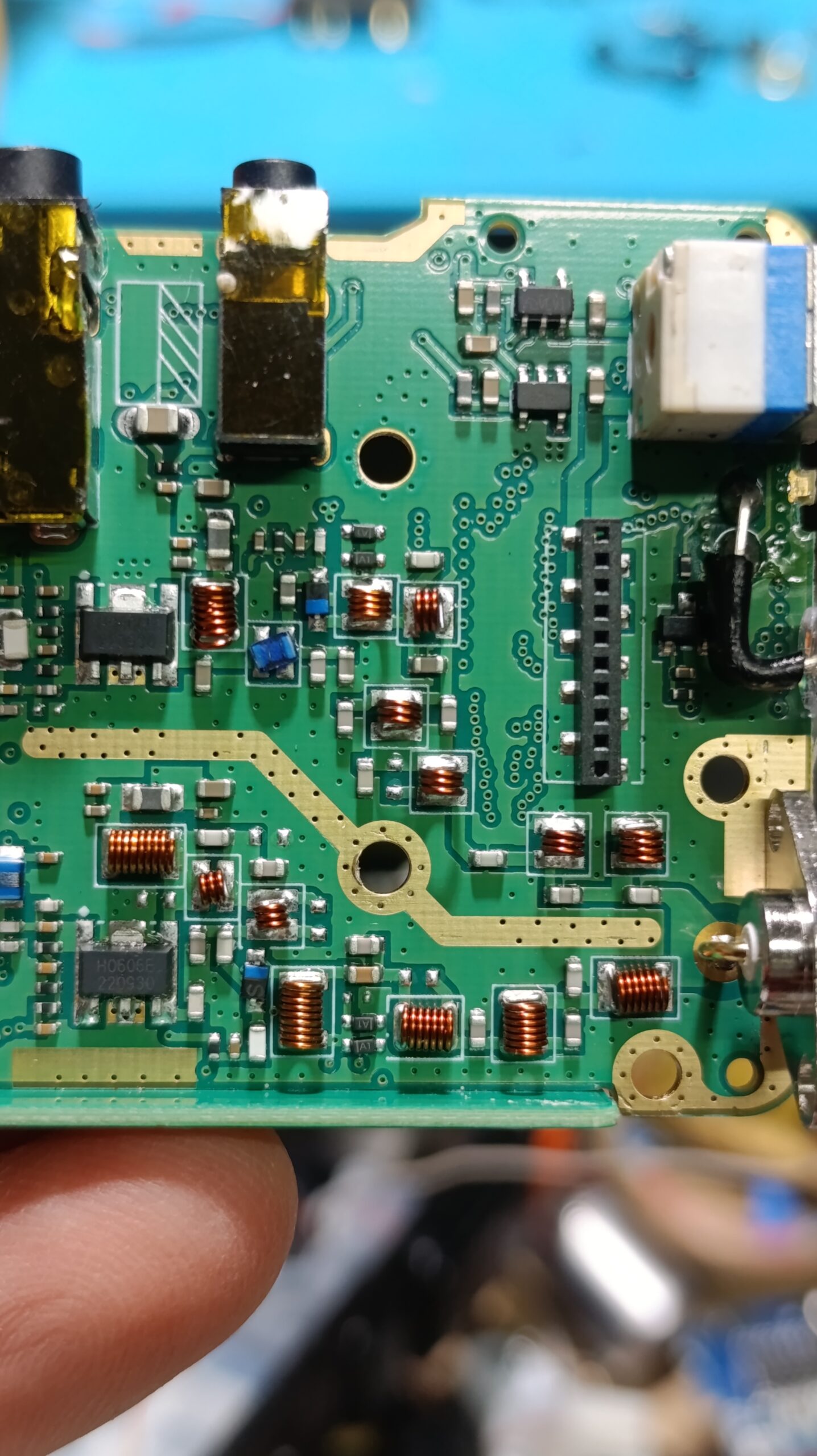 Бауфенга беше спрял да предава затова му направих „дисекция“, двата банда са разделени с ЛЦ филтри и са с идентични крайни транзистори, за да го използваме за ехолинка му направих извод от RX индикаторния светодиод подпрян с един резистор спрямо захранването. Така всъщност колектора на транзистора освен светодиода за индикация ми ъправляваше и оптрона който бях закачил на малинката и така тя детектваше задействано приемане.