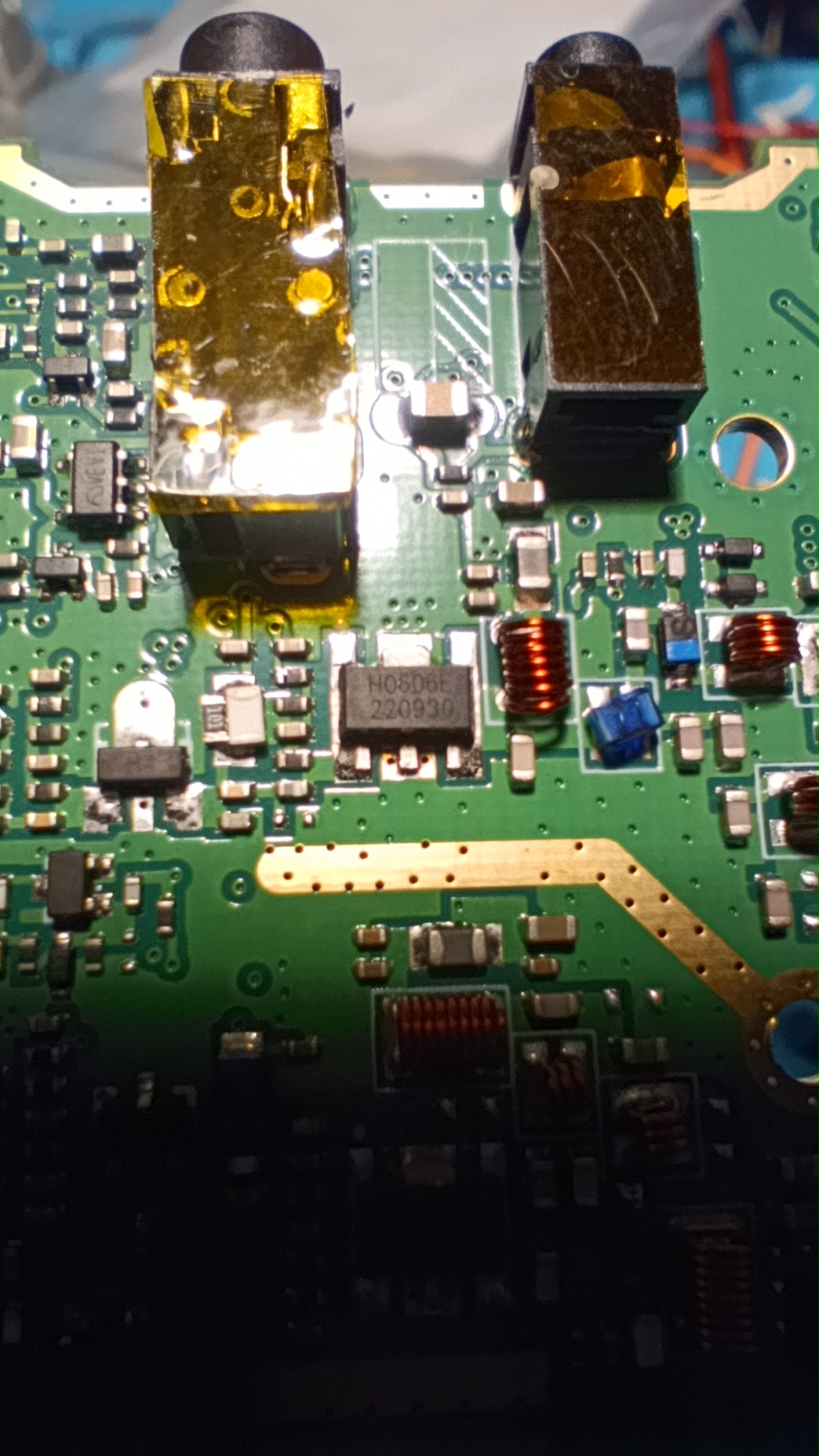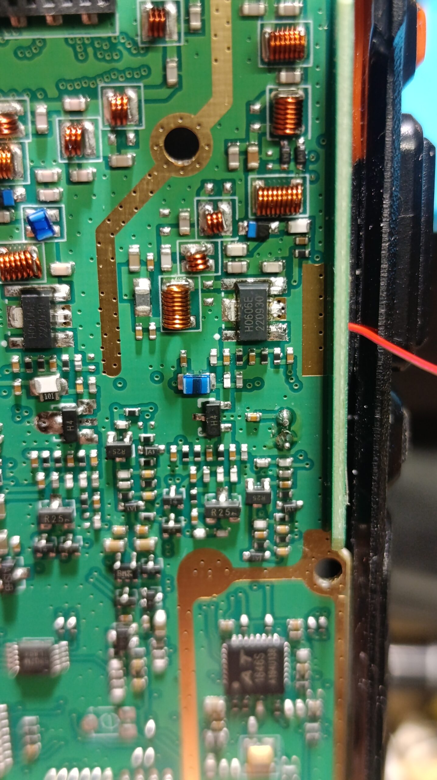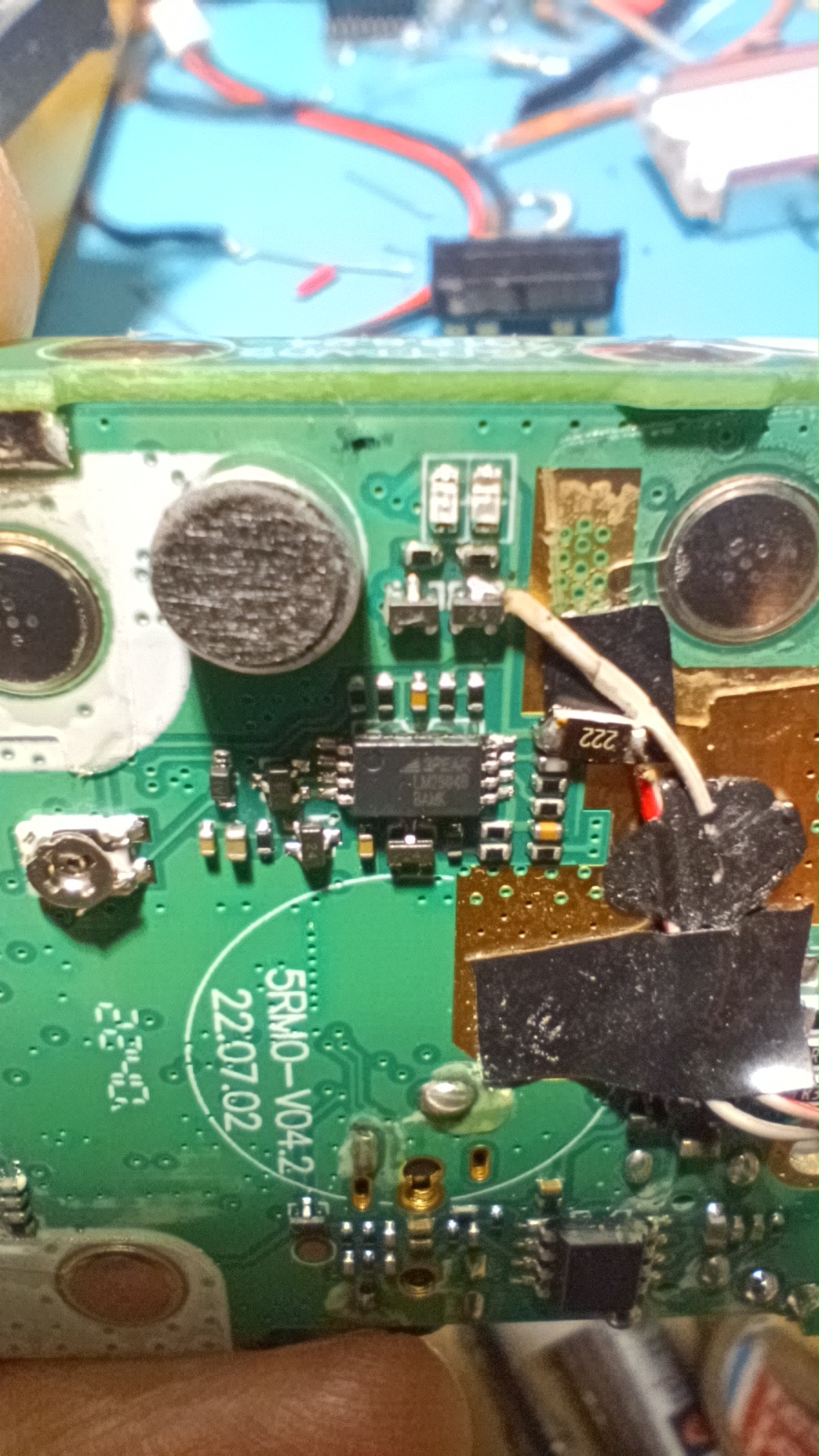 Бауфенга беше спрял да предава затова му направих „дисекция“, двата банда са разделени с ЛЦ филтри и са с идентични крайни транзистори, за да го използваме за ехолинка му направих извод от RX индикаторния светодиод подпрян с един резистор спрямо захранването. Така всъщност колектора на транзистора освен светодиода за индикация ми ъправляваше и оптрона който бях закачил на малинката и така тя детектваше задействано приемане.